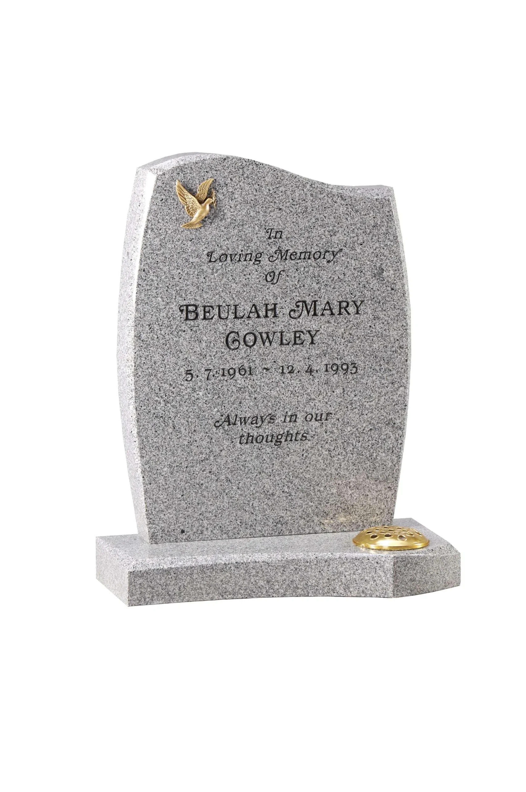 WG2 has a bronze ornament that adds symbolism to this light grey granite Shaped and chamfered base to match top of headstone.